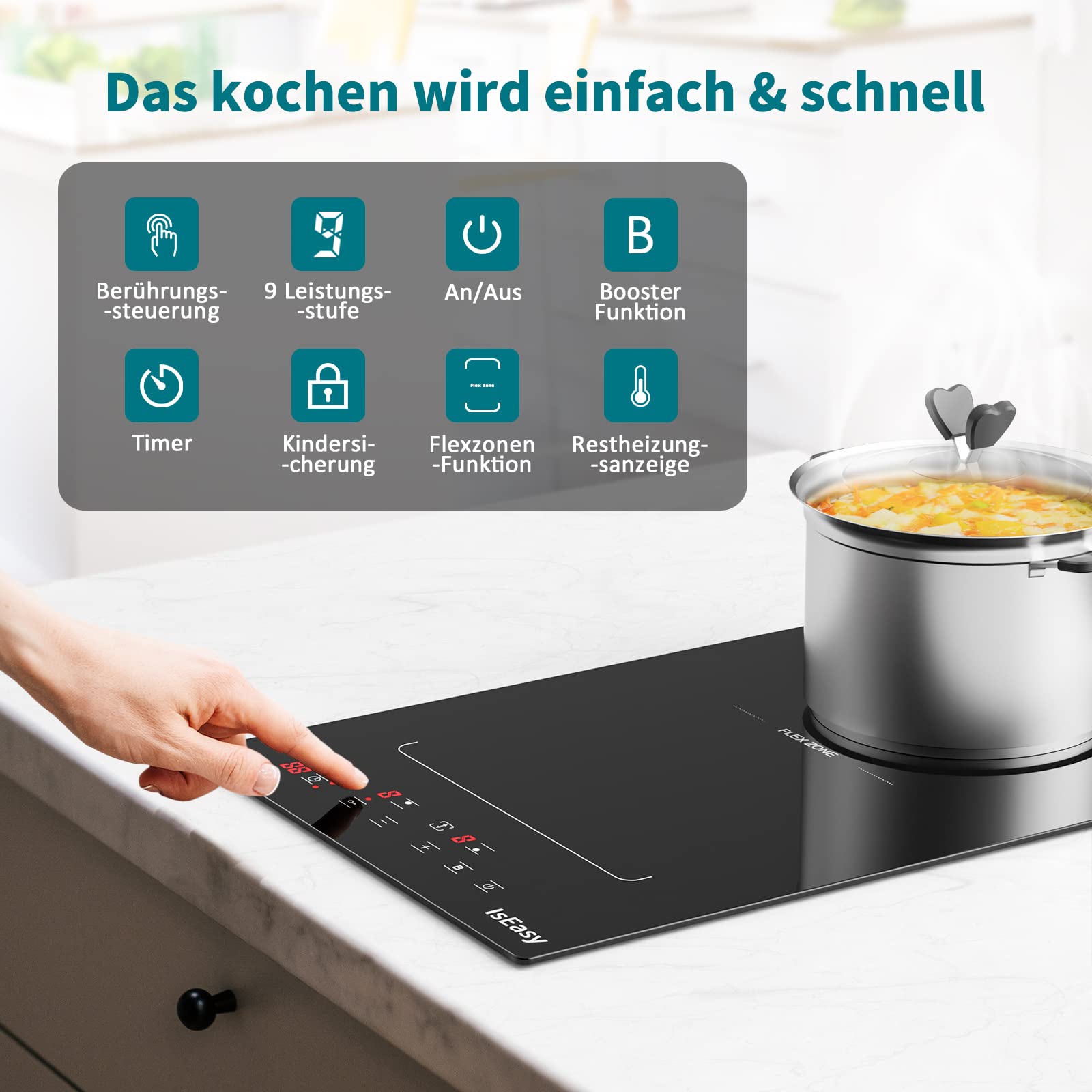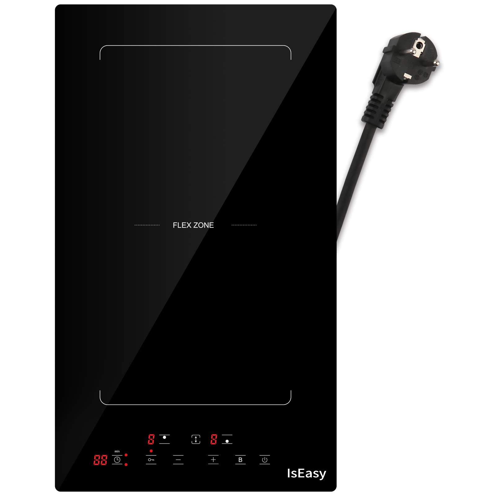 IsEasy Domino Induktionskochfeld Mit Flexzonen - 2 Platten, 9 Leistungsstufen, Boost-Funktion, Kindersicherung, 1-99min Timer, 29.5cm, 3400W, Schwarz