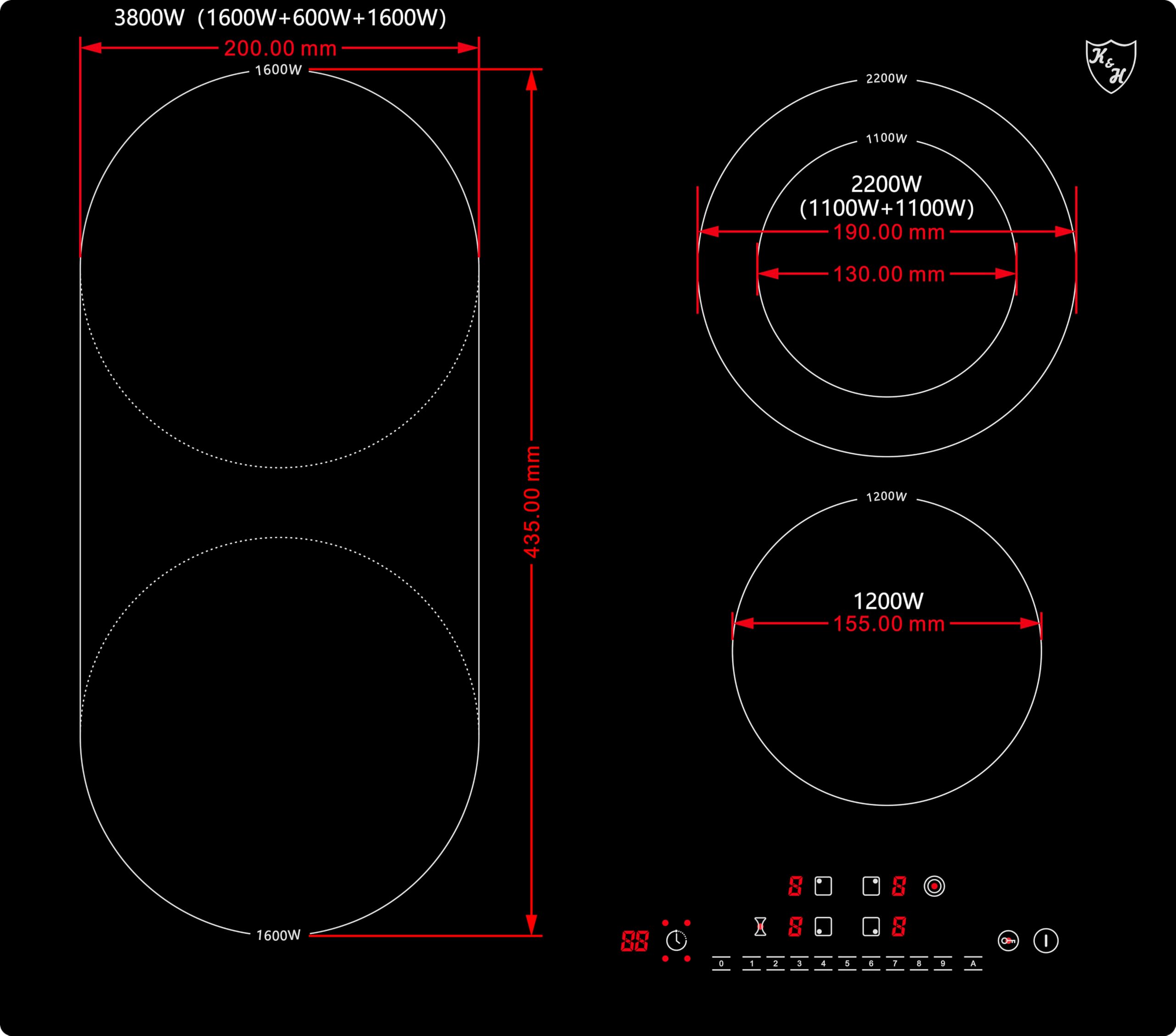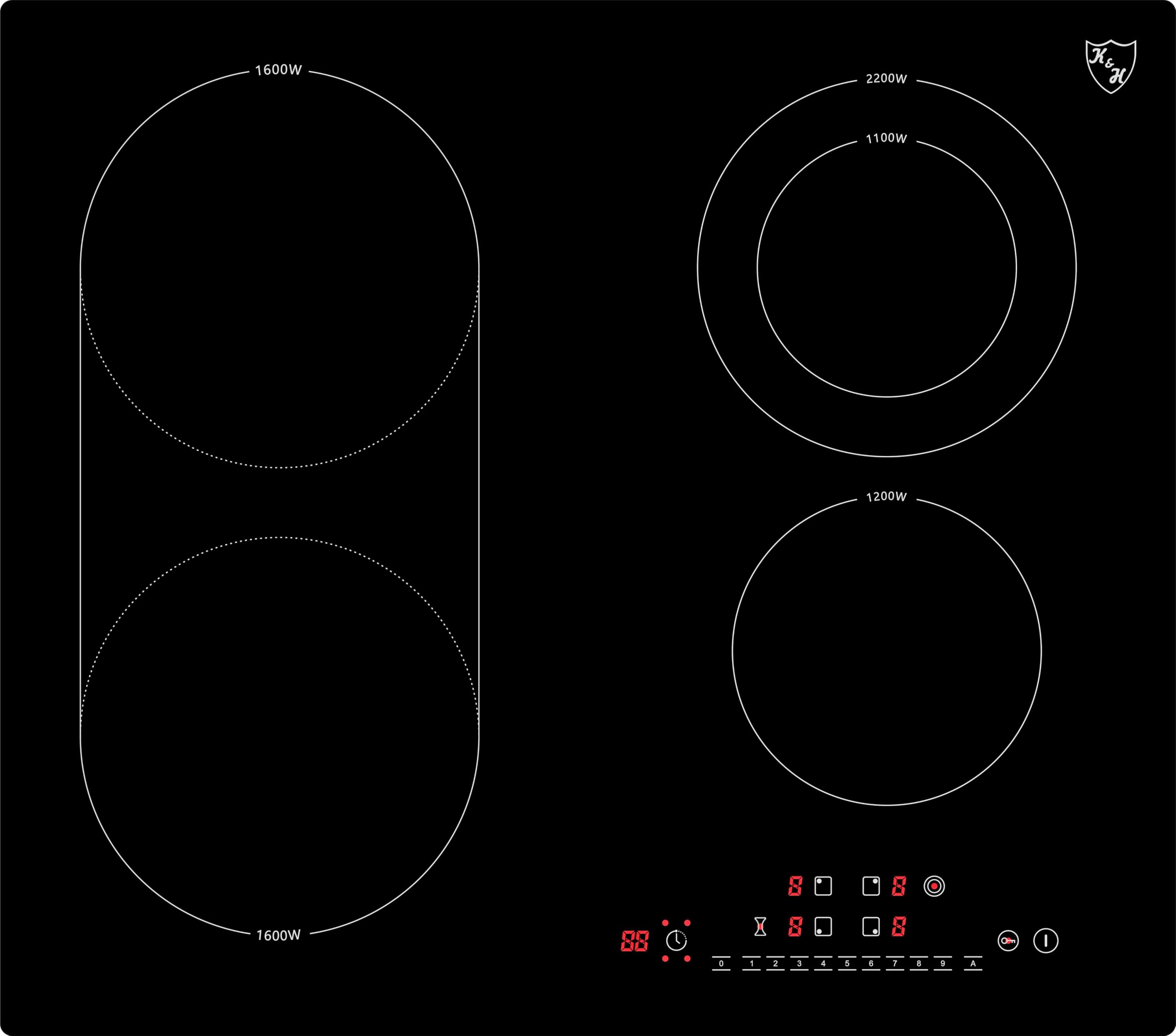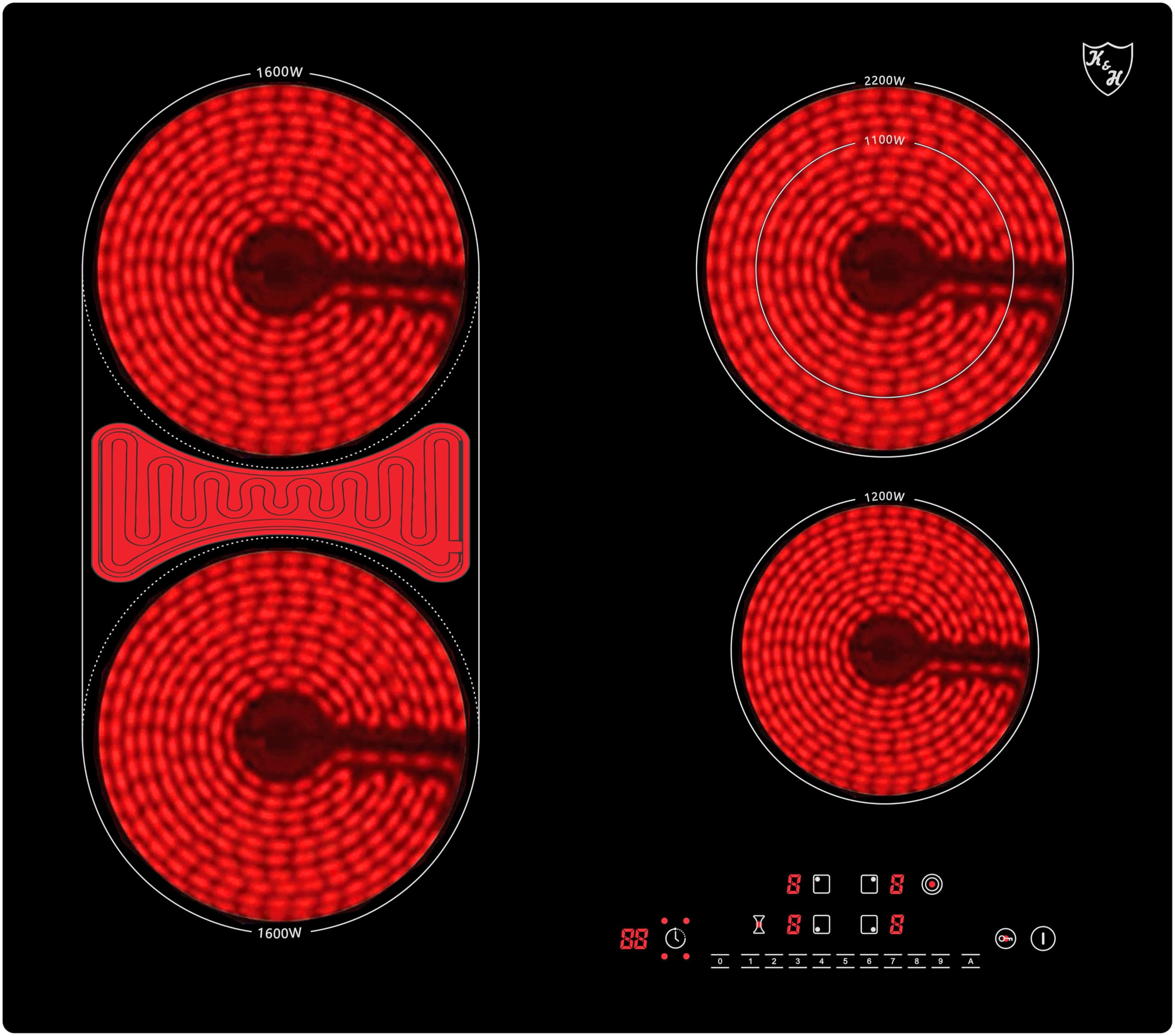K&H Glaskeramikkochfeld NCD-7207D [4 ZONEN] - Herdplatte 4 Kochfelder mit Großer Bräterzone - Kochfeld 4 Platten Autark - Kochplatten 4er - Starkstrom-Anschluss - 59CM - 7200 Watt - 9 Leistungsstufen